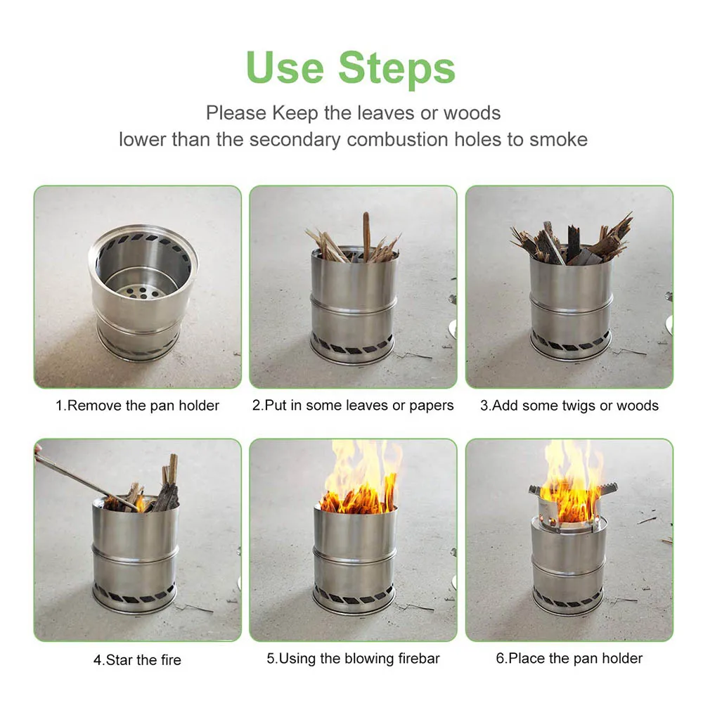 3.High Efficiency: Double wall construction creates ultra-clean gasification and a secondary combustion. And the secondary combustion keeps camping wood stove burning continued for 20mins with dry firewood and wood chips