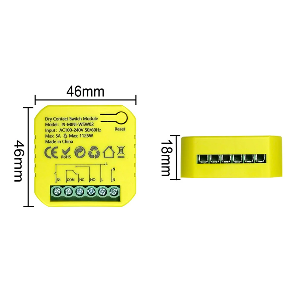 Features: 1.APP Remote Control: After connecting the dry contact switch module to the app, you can effortlessly turn the device on or off from anywhere. 2.Voice Activation: With a simple command, activate the smart life WiFi switch module via voice assistants, making control hands-free. 3.Timer Functionality: Use the timer on the dry contact relay to schedule devices, ensuring they operate at specific times while saving energy. 4.Relay State Command: Set the smart switch module to remember your last configuration, preventing power interruptions. 5.Device Sharing: Share this WiFi module toggle with family members who have a compatible app account, granting control to others. Specification: Note: